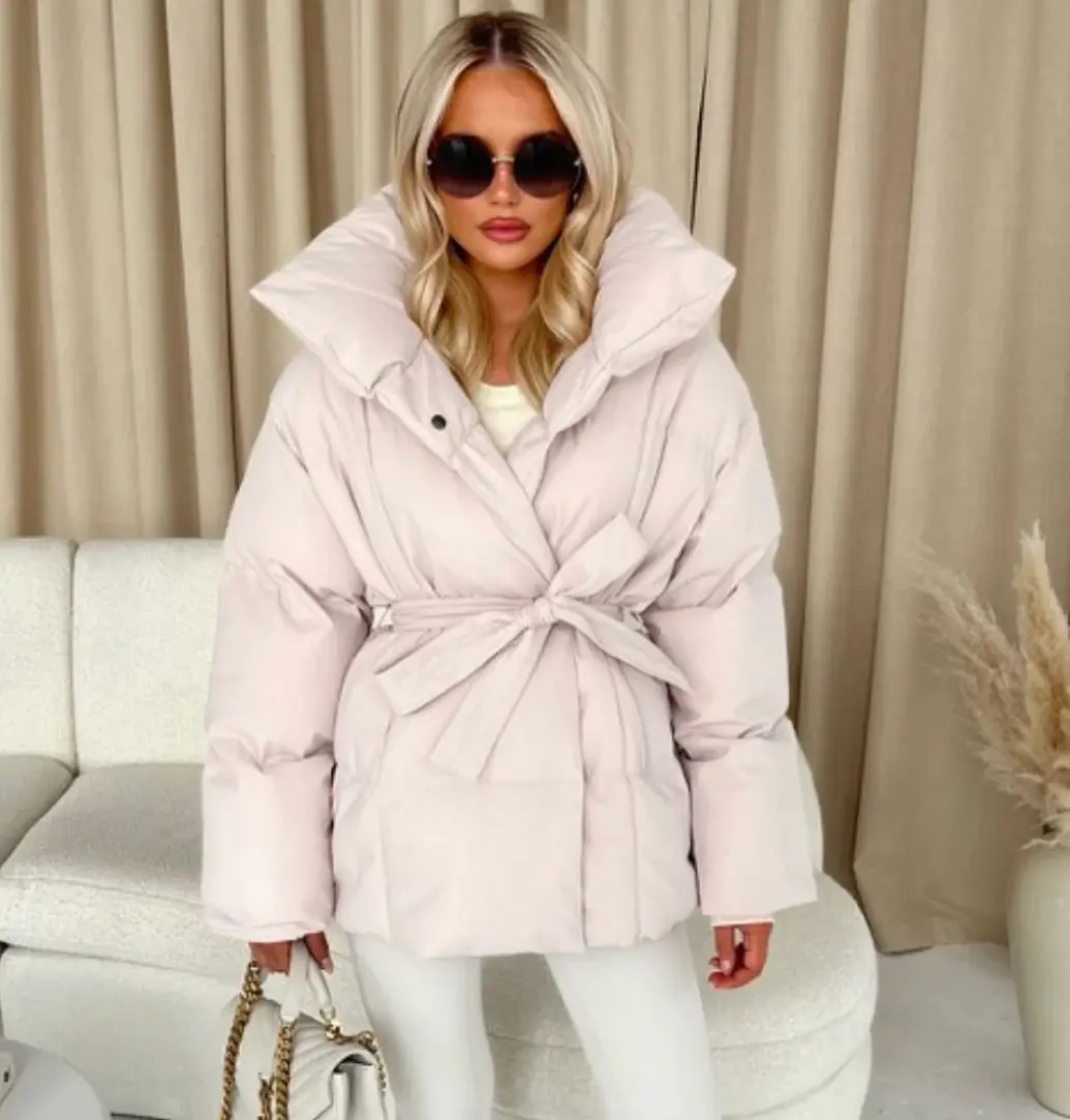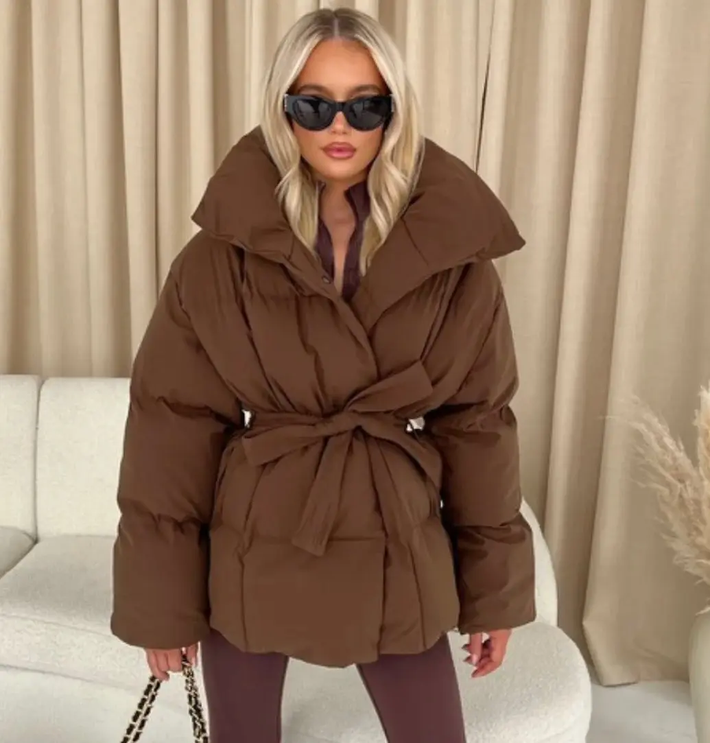 Fashion Lace Up Cotton Jacket Women Casual Stand Collar Single Breasted Pocket Loose Outerwears Lady Winter Daily Street Jackets